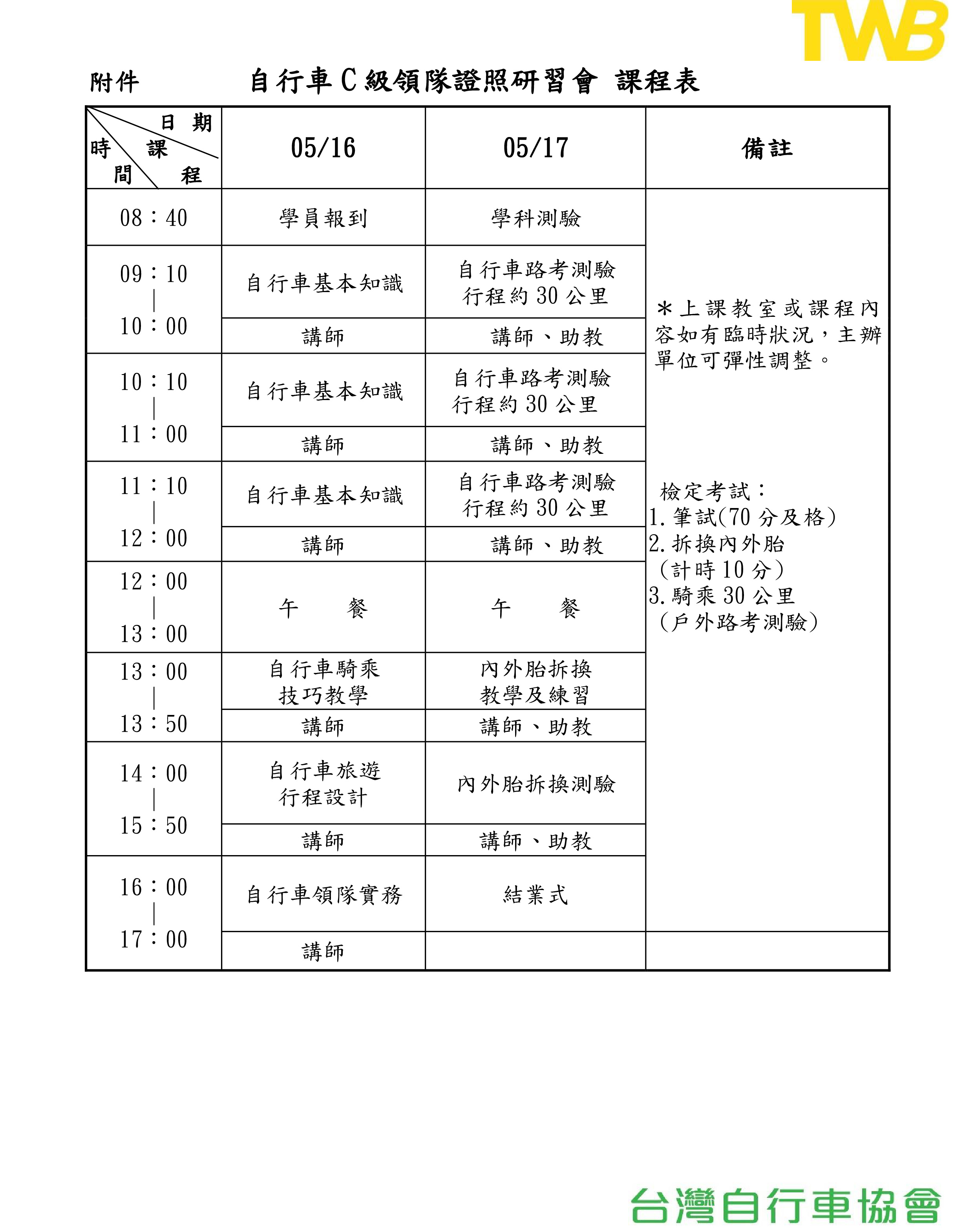 研習期間全程參與無缺課者授予研習證書;通過學科、術科檢定考試成績及格者(70分及格),由本會授與自行車C級領隊證